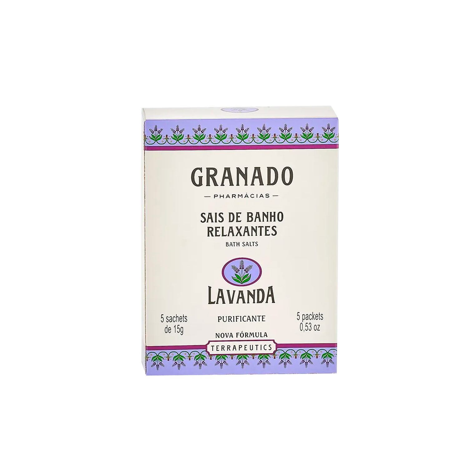 01 Caixa com 05 sachês de Sais de Banho Lavanda Granado 15g cada.